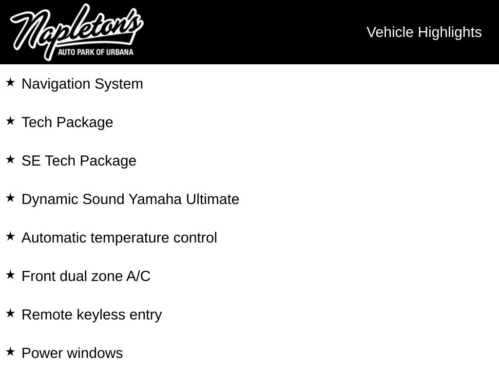 Dealer Discount of $1,254 off MSRP 12.3" Digital Driver Display, 3rd row seats: split-bench, Active Cruise Control, Alloy wheels, Auto High-beam Headlights, Automatic temperature control, Brake assist, Dynamic Sound Yamaha Ultimate, Exterior Parking Camera Rear, Front dual zone A/C, Fully automatic headlights, Garage door transmitter: HomeLink, Headlight cleaning, Heated door mirrors, Heated front seats, Illuminated entry, Navigation System, Occupant sensing airbag, Power door mirrors, Power driver seat, Power Liftgate, Power Panoramic Sunroof, Power windows, Rain sensing wipers, Remote keyless entry, SE Tech Package, Security system, Tech Package. 24/30 City/Highway MPG