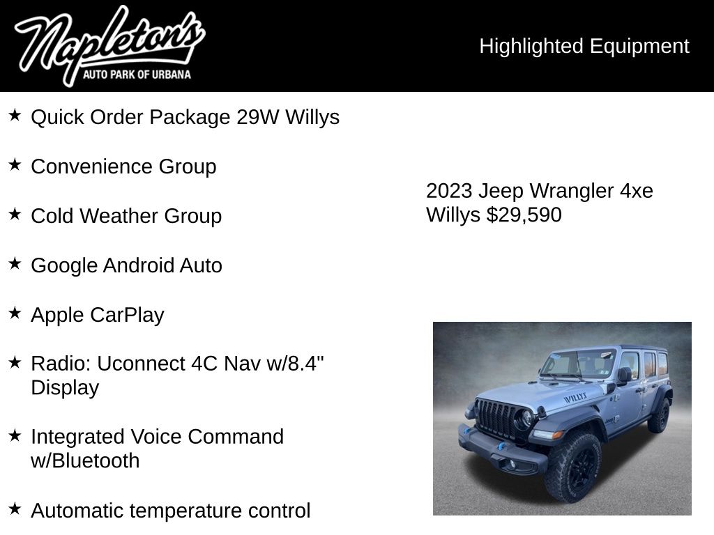 Whether you're tackling the trails or navigating the city streets, this 2023 Jeep Wrangler Base 4xe is ready to take you there in style and comfort. Experience the perfect blend of capability, technology, and refinement â" schedule a test drive today and discover the true power of the Jeep brand.