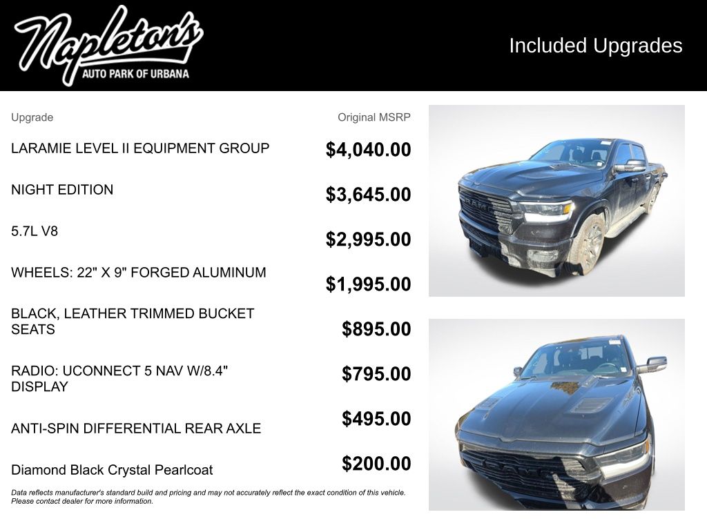 Experience the power, style, and sophistication of this remarkable vehicle. Visit our showroom today and let us demonstrate how this Ram 1500 Laramie Night Edition can elevate your driving experience. We're confident you'll be impressed by its uncompromising performance and refined craftsmanship. Take the first step towards owning this exceptional truck and schedule a test drive at your earliest convenience.
