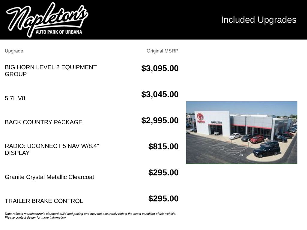Discover the perfect blend of capability, technology, and style with this 2023 Ram 1500 Big Horn/Lone Star Back Country Package. Boasting a powerful HEMI 5.7L V8 engine with eTorque and 4-wheel drive, this truck is ready to take on any adventure. Elevate your driving experience with the comprehensive Big Horn Level 2 Equipment Group, which includes a host of premium features like the Uconnect 5 infotainment system with an 8.4-inch touchscreen display, Apple CarPlay, Android Auto, and a premium 9-speaker audio system.